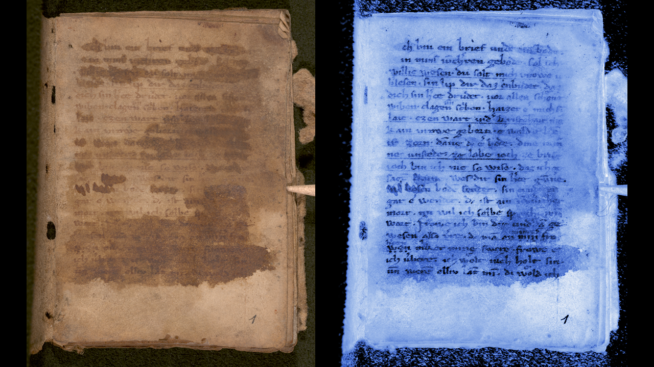 The probably smallest manuscript in German medieval literature in the form of a codex (each folio is approximately 7x5 cm) was found inside a wall of a demolished building in Zurich. It contains what is known as Züricher Liebesbriefe. Sadly, the tiny manuscript was damaged by water with its writing partially washed off. In some places, it has become totally unreadable. In the 19th century, attempts to make the ink visible with chemical reagents only made things worse. With modern state-of-the-art technology, in particular multispectral imaging and image processing, it was possible to recover the damaged text and finally read the love letters which probably date to early 14th century.