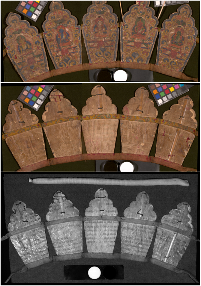 This beautiful and colorful Tibetan crown can tell us a lot about the use of pigments in Tibet. It also has an invisible secret on the back side: The fragile crown was obviously stabilised by gluing thick sheets of paper to its back. The assumption that there was text on some of these sheets was confirmed by our methods of analysis: With the aid of the infrared reflectography imaging system, the writing can be reconstructed. However, many interesting questions still remain open: Which manuscripts were sacrificed for the production of this crown and does the text they contain have anything to do with the object itself?